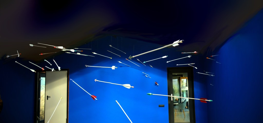 În Sala mare suntem întâmpinați de un albastru intenționat contrastant cu elementul principal al instalației – săgeata.