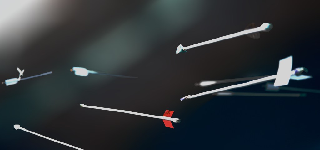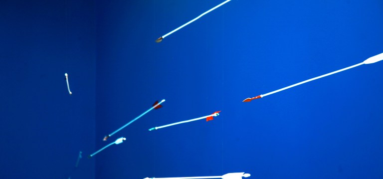 Filtrez pentru a ajunge la caracteristicile lor universale: sunt ușoare și se deplasează rapid; au o ascuțime și urmăresc să lovească o țintă; dau dovadă de o consistență, de o densitate, dar se pot și sfărâma. Pentru a putea fi extrase din lumea Formelor ideale, trebuie mai întâi să găsească un mobil, de data aceasta sub forma săgeților din material ceramic.
