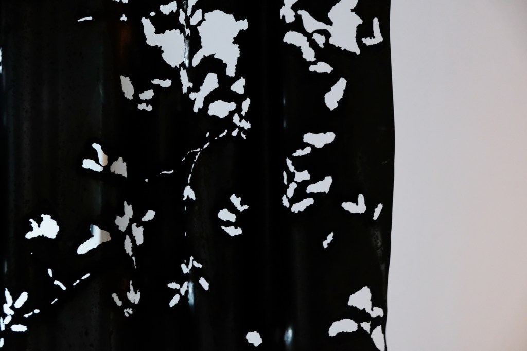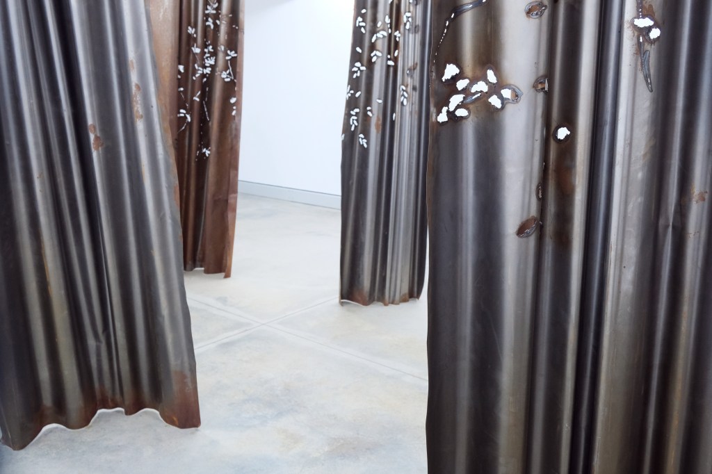 Perdelele instalației lui Anca Stătică sunt forme repetate, modelate ”la rece” din coli de tablă mari de dimensiunea reală a perdelelor. Este impresionantă fidelitatea curburilor drapajelor, cât și naturalețea traforajelor, acestea sunt detaliile pe care artista mizează pentru a ne transfera în atmosfera grădinii.