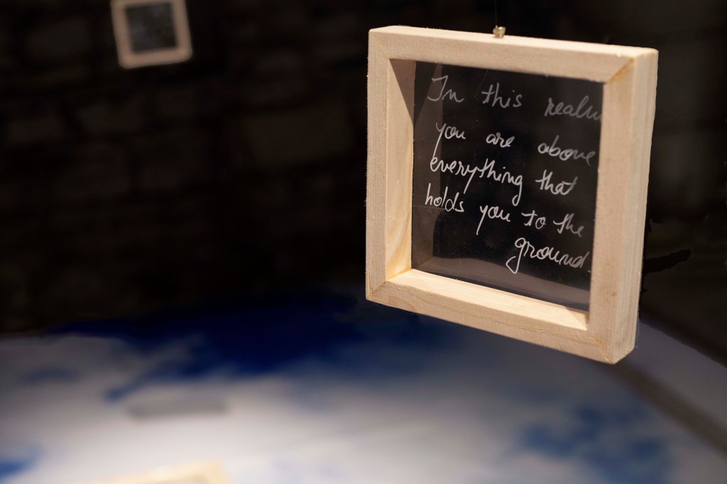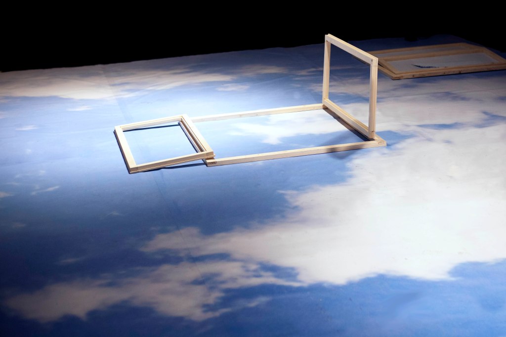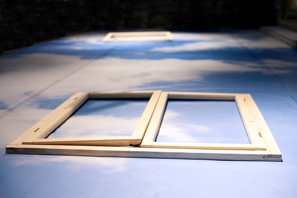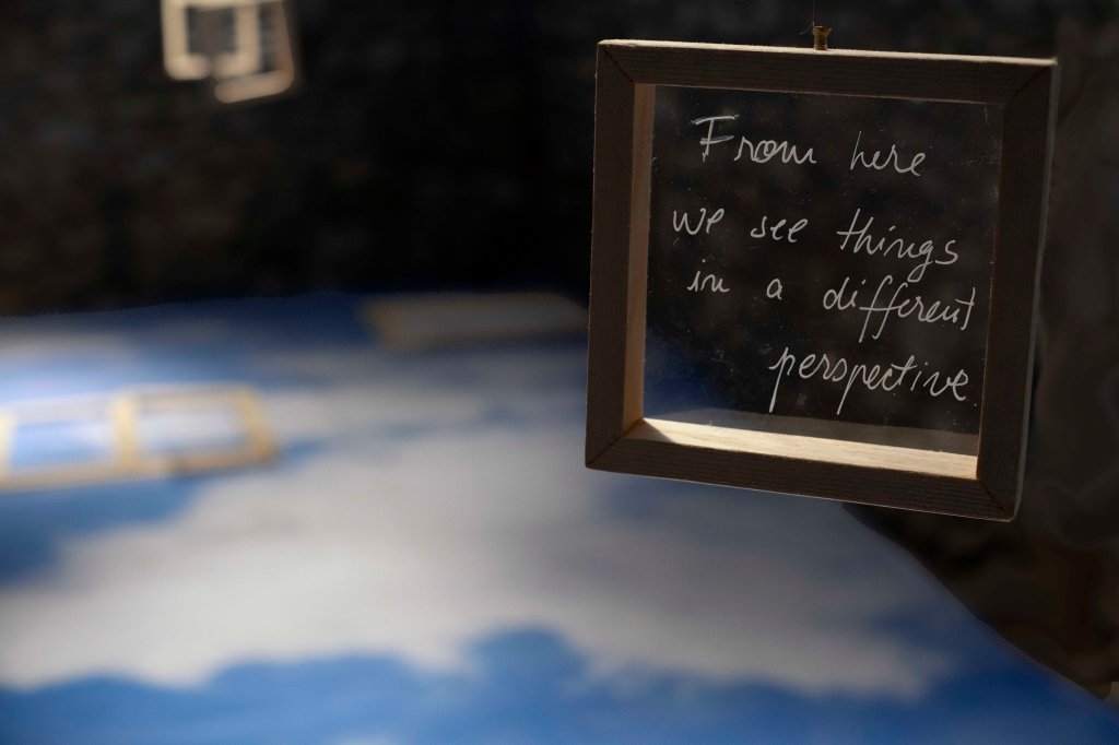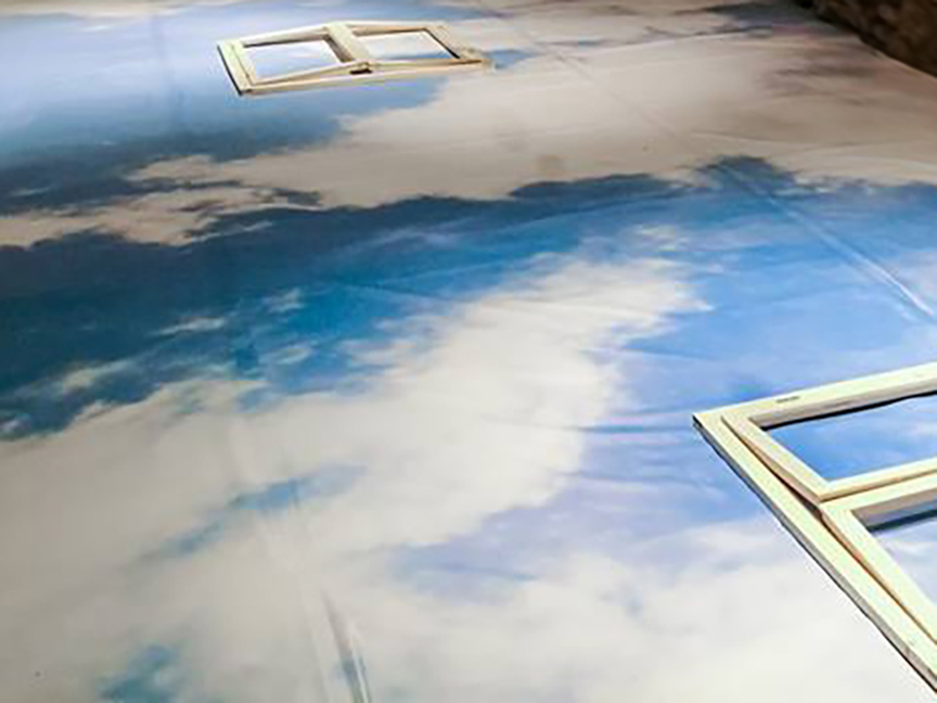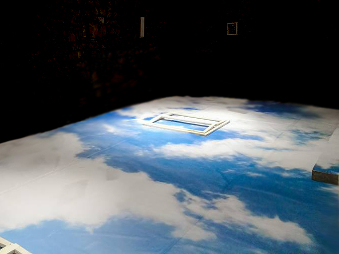 They said the sky is the limit – instalație artistică (site specific): print, rame de fereastră din lemn (funcționale pentru interacțiune), 3 rame cu text, dimensiuni 970x350cm amprenta la sol